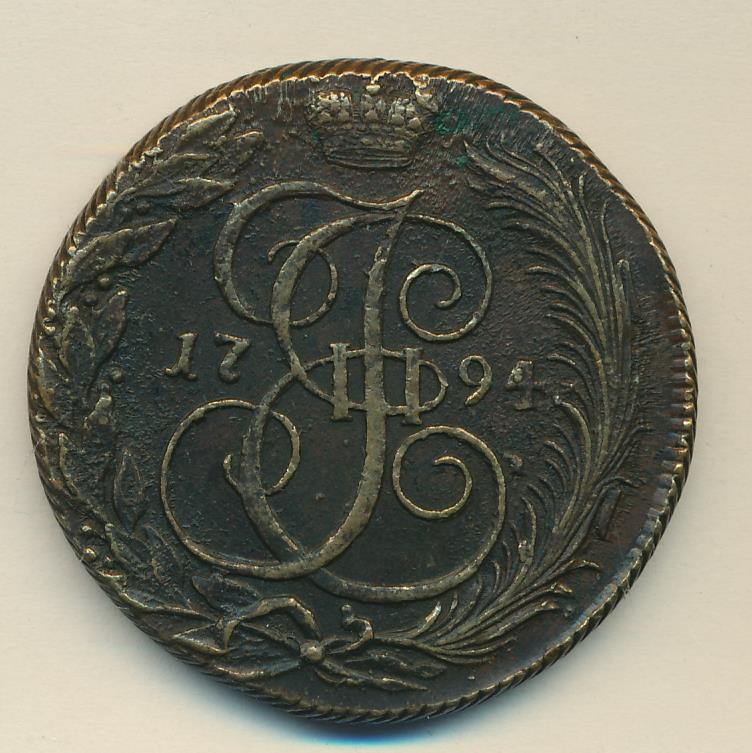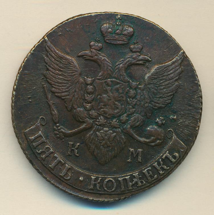 Лицевая сторона — двуглавый орел (выделяют 17 типов орла) и обозначение номинала (пять копеекъ), оборотная — вензель Екатерины II и дата. Нормативный вес — 51,19 грамма, гурт — сетка или шнур.