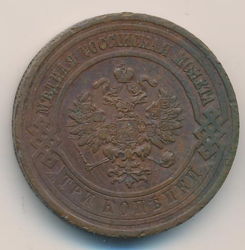 Лицевая сторона — двуглавый орел, надпись МЕДНАЯ РОССIЙСКАЯ МОНЕТА и обозначение номинала (три копейки); оборотная — обозначение номинала (3 копейки) в бусовом ободке и дата. Нормативный вес — 9,83 грамма, гурт рубчатый.