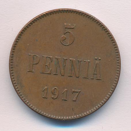 Лицевая сторона — вензель Александра II, оборотная — номинал (5 PENNIA) и дата. Нормативный вес — 6,40 грамма, гурт гладкий.
