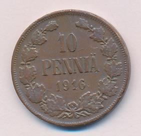 Лицевая сторона — вензель Александра II, оборотная — номинал (10 PENNIA) в венке из дубовых ветвей и дата. Нормативный вес — 12,80 грамма, гурт гладкий.