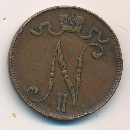 Лицевая сторона — вензель Александра II, оборотная — номинал (5 PENNIA) и дата. Нормативный вес — 6,40 грамма, гурт гладкий.