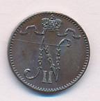 Лицевая сторона — вензель Александра II, оборотная — номинал (1 PENNIA) и дата. Нормативный вес — 1,28 грамма, гурт гладкий.