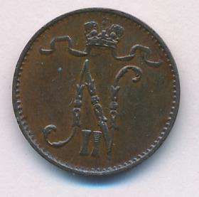 Лицевая сторона — вензель Александра II, оборотная — номинал (1 PENNIA) и дата. Нормативный вес — 1,28 грамма, гурт гладкий.