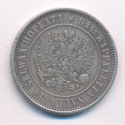 Лицевая сторона — российский двуглавый орел с гербом Великого княжества Финляндского на груди в кольцевой надписи с указанием количества штук (94,48) из фунта сплава серебра, оборотная — номинал и дата в венке из дубовых листьев. Проба — 868, нормативный вес — 5,18 грамма, гурт рубчатый.