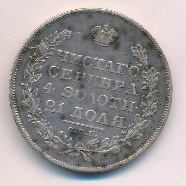 Лицевая сторона - «масонский орел», надпись «МОНЕТА РУБЛЬ» и дата, оборотная - окруженная венком из лавровой и дубовой ветвей надпись «ЧИСТАГО СЕРЕБРА 4 ЗОЛОТН 21 ДОЛЯ». Проба — 868, нормативный вес — 20,73 грамма.