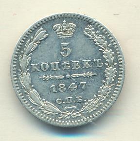 Лицевая сторона — новый гербовый орел с поднятыми крыльями, оборотная —обозначение номинала (5 копеекъ), окруженное венком из лавровой и дубовой ветвей и дата. Проба — 868, нормативный вес — 1,04 грамма.