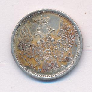 Лицевая сторона — новый гербовый орел с поднятыми крыльями, оборотная —обозначение номинала (5 копеекъ), окруженное венком из лавровой и дубовой ветвей и дата. Проба — 868, нормативный вес — 1,04 грамма.