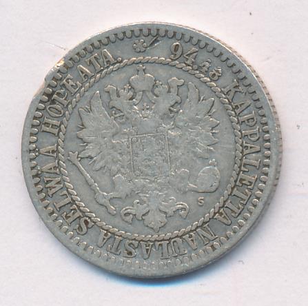 Лицевая сторона — российский двуглавый орел с гербом Великого княжества Финляндского на груди в кольцевой надписи с указанием количества штук (94,48) из фунта сплава серебра, оборотная — номинал и дата в венке из дубовых листьев. Проба — 868, нормативный вес — 5,18 грамма, гурт рубчатый.