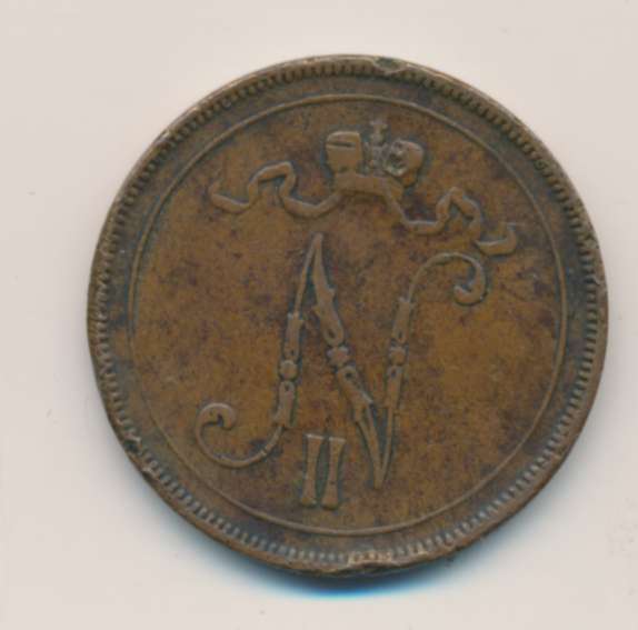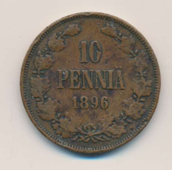 Лицевая сторона — вензель Александра II, оборотная — номинал (10 PENNIA) в венке из дубовых ветвей и дата. Нормативный вес — 12,80 грамма, гурт гладкий.