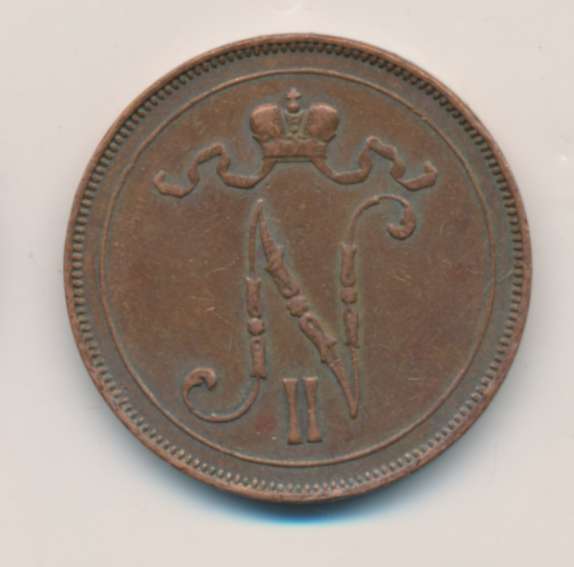 Лицевая сторона — вензель Александра II, оборотная — номинал (10 PENNIA) в венке из дубовых ветвей и дата. Нормативный вес — 12,80 грамма, гурт гладкий.