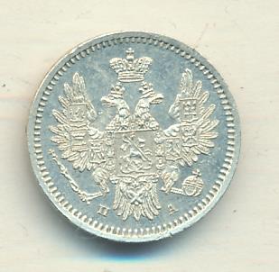Лицевая сторона — новый гербовый орел с поднятыми крыльями, оборотная —обозначение номинала (5 копеекъ), окруженное венком из лавровой и дубовой ветвей и дата. Проба — 868, нормативный вес — 1,04 грамма.