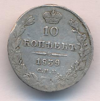 Лицевая сторона — новый гербовый орел с поднятыми крыльями, оборотная —обозначение номинала (10 копеекъ), окруженное венком из лавровой и дубовой ветвей и дата. Проба — 868, нормативный вес — 2,07 грамма.