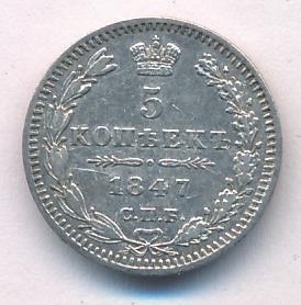 Лицевая сторона — новый гербовый орел с поднятыми крыльями, оборотная —обозначение номинала (5 копеекъ), окруженное венком из лавровой и дубовой ветвей и дата. Проба — 868, нормативный вес — 1,04 грамма.