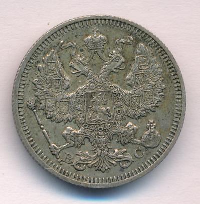 Лицевая сторона — гербовый орел, оборотная —обозначение номинала (20 копеекъ), окруженное венком из лавровой и дубовой ветвей и дата.