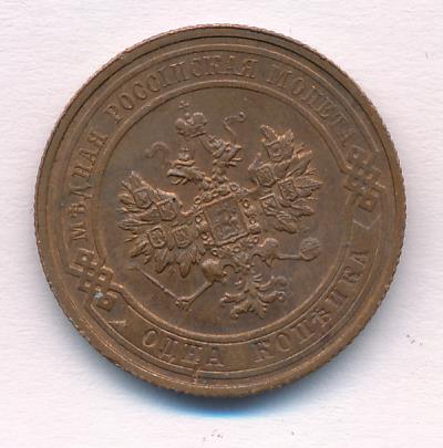 Лицевая сторона — двуглавый орел, надпись МЕДНАЯ РОССIЙСКАЯ МОНЕТА и обозначение номинала (одна копейка); оборотная — обозначение номинала (1 копейка) в бусовом ободке и дата. Нормативный вес — 3,28 грамма, гурт рубчатый.