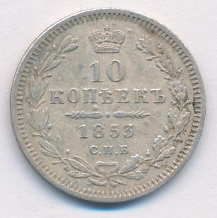 Лицевая сторона — новый гербовый орел с поднятыми крыльями, оборотная —обозначение номинала (10 копеекъ), окруженное венком из лавровой и дубовой ветвей и дата. Проба — 868, нормативный вес — 2,07 грамма.