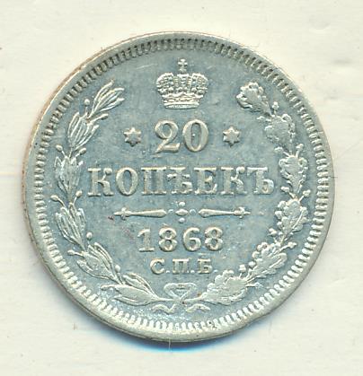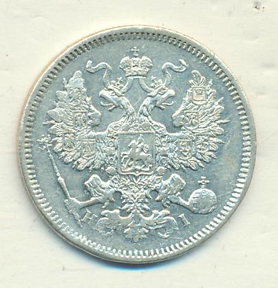 Лицевая сторона — гербовый орел, оборотная —обозначение номинала (20 копеекъ), окруженное венком из лавровой и дубовой ветвей и дата.