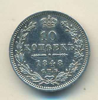 Лицевая сторона — новый гербовый орел с поднятыми крыльями, оборотная —обозначение номинала (10 копеекъ), окруженное венком из лавровой и дубовой ветвей и дата. Проба — 868, нормативный вес — 2,07 грамма.