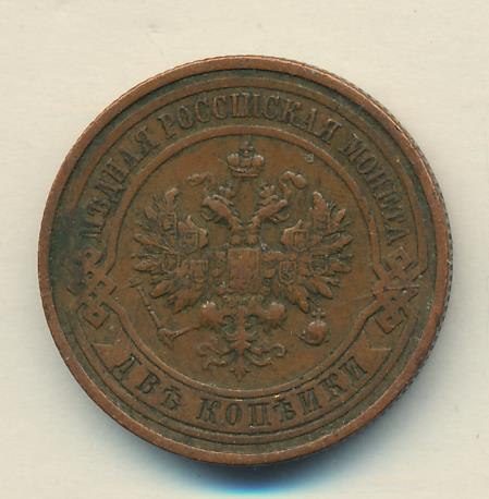 Лицевая сторона — двуглавый орел, надпись МЕДНАЯ РОССIЙСКАЯ МОНЕТА и обозначение номинала (две копейки); оборотная — обозначение номинала (2 копейки) в бусовом ободке и дата. Нормативный вес — 6,55 грамма, гурт рубчатый.