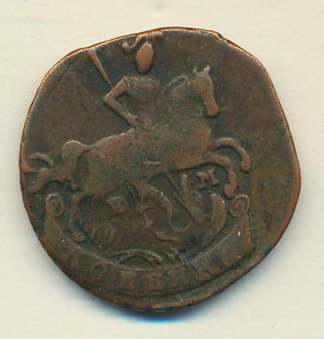 Лицевая сторона — Георгий Победоносец и обозначение номинала (копейка) в картуше, оборотная — вензель Екатерины II и дата. Нормативный вес — 10,24 грамма, гурт — сетка, или узор, или шнур.