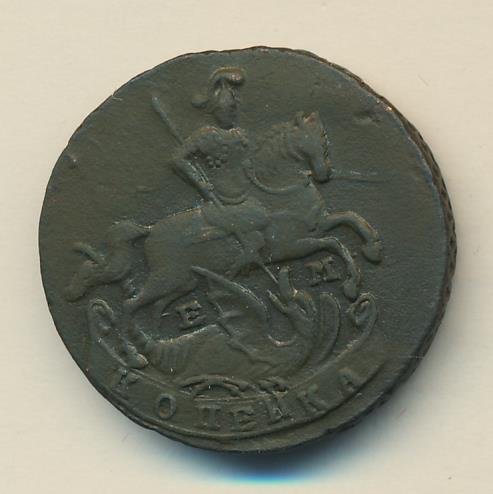 Лицевая сторона — Георгий Победоносец и обозначение номинала (копейка) в картуше, оборотная — вензель Екатерины II и дата. Нормативный вес — 10,24 грамма, гурт — сетка, или узор, или шнур.