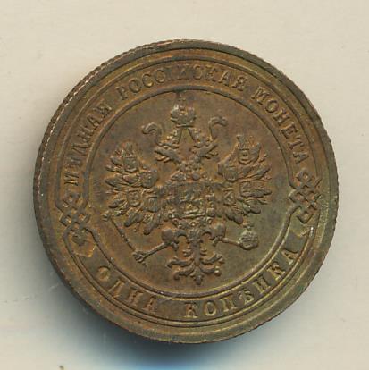 Лицевая сторона — двуглавый орел, надпись МЕДНАЯ РОССIЙСКАЯ МОНЕТА и обозначение номинала (одна копейка); оборотная — обозначение номинала (1 копейка) в бусовом ободке и дата. Нормативный вес — 3,28 грамма, гурт рубчатый.