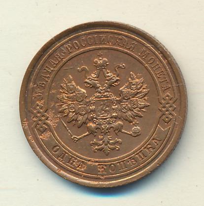 Лицевая сторона — двуглавый орел, надпись МЕДНАЯ РОССIЙСКАЯ МОНЕТА и обозначение номинала (одна копейка); оборотная — обозначение номинала (1 копейка) в бусовом ободке и дата. Нормативный вес — 3,28 грамма, гурт рубчатый.