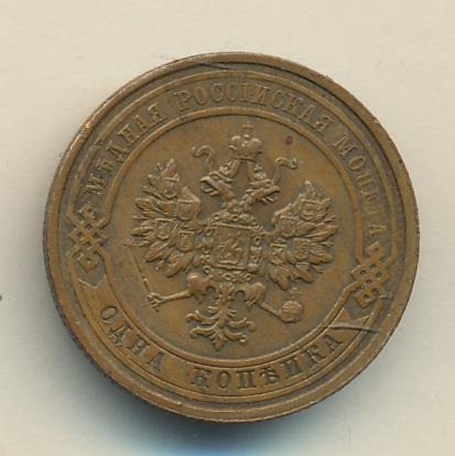 Лицевая сторона — двуглавый орел, надпись МЕДНАЯ РОССIЙСКАЯ МОНЕТА и обозначение номинала (одна копейка); оборотная — обозначение номинала (1 копейка) в бусовом ободке и дата. Нормативный вес — 3,28 грамма, гурт рубчатый.