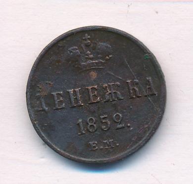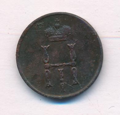 Лицевая сторона — вензель Николая I, оборотная — обозначение номинала (денежка) и дата. Нормативный вес — 2,56 грамма, гурт гладкий.