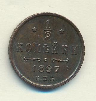 Лицевая сторона — вензель Александра II в венке из лавровой и дубовой ветвей; оборотная — обозначение номинала (1/2 копейки) и дата. Нормативный вес — 1,64 грамма, гурт рубчатый.