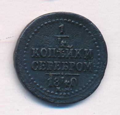 На новых монетах равенство серебряному курсу указано прямо в номинале: «1/4 КОПЕЙКИ СЕРЕБРОМ». Указ об их выпуске следует 6 сентября 1840 года («О новой медной монете на серебро 16-рублевого в пуде достоинства»). Массовая чеканка началось за год до этого на Екатеринбургском (знак ЕМ) и Сузунском (знак СМ) дворах. В качестве временной меры в 1840-1843 годах к ним подключается Ижорский завод (знак СПМ). С 1844 года после «значительного скопления медной монеты в народном обращении» в Екатеринбурге производство прекращается, а в Сузуне сокращается.