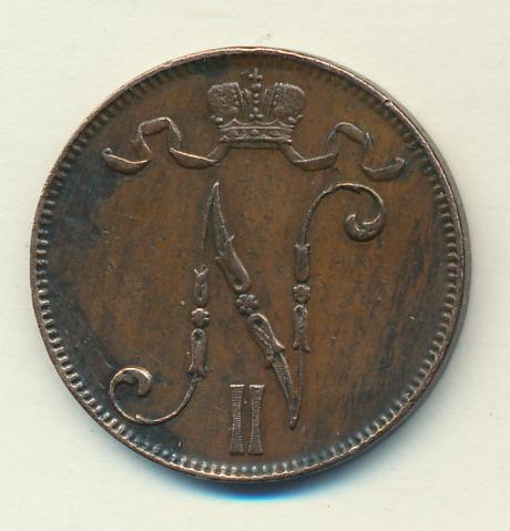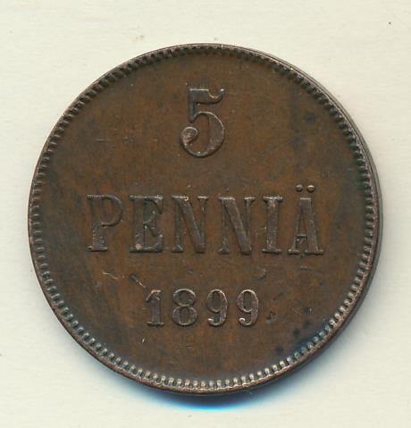Лицевая сторона — вензель Александра II, оборотная — номинал (5 PENNIA) и дата. Нормативный вес — 6,40 грамма, гурт гладкий.