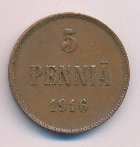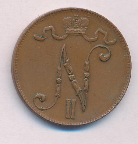 Лицевая сторона — вензель Александра II, оборотная — номинал (5 PENNIA) и дата. Нормативный вес — 6,40 грамма, гурт гладкий.