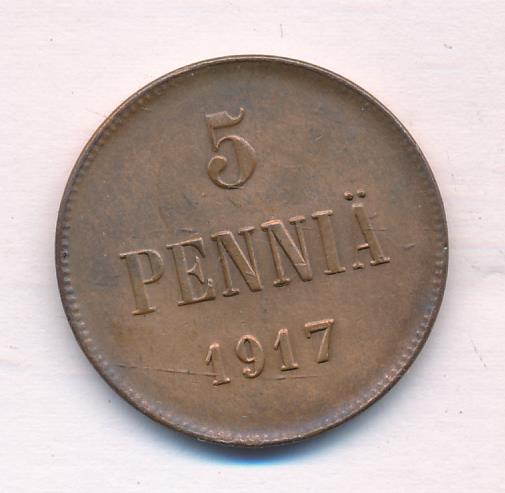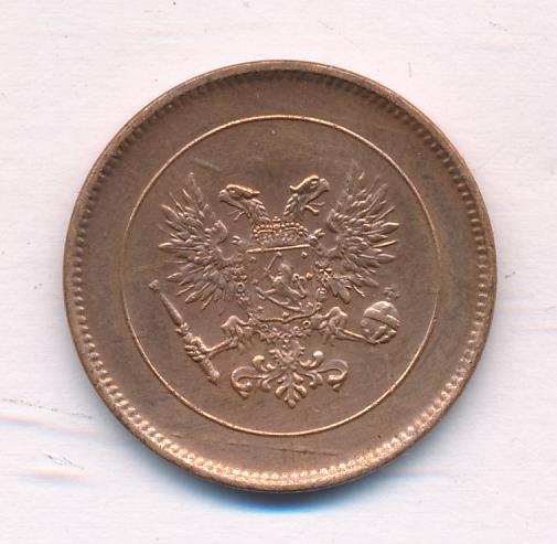 Лицевая сторона — вензель Александра II, оборотная — номинал (5 PENNIA) и дата. Нормативный вес — 6,40 грамма, гурт гладкий.