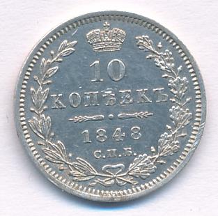 Лицевая сторона — новый гербовый орел с поднятыми крыльями, оборотная —обозначение номинала (10 копеекъ), окруженное венком из лавровой и дубовой ветвей и дата. Проба — 868, нормативный вес — 2,07 грамма.