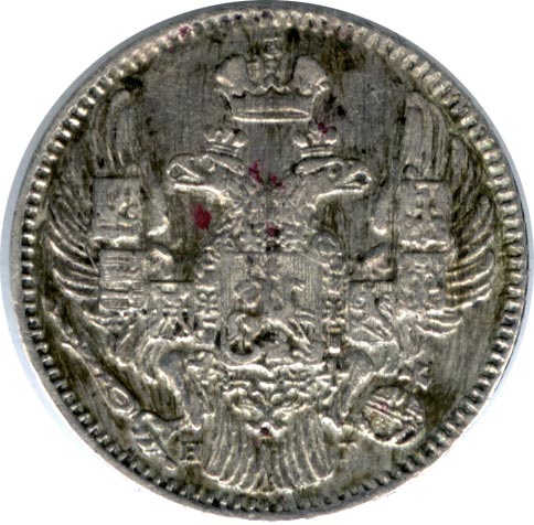 В январе 1830 года Николай I дает министру финансов Е. Ф. Канкрину устное указание «о сделании на золотых и серебряных монетах орла как на платиновых». На новом гербе крылья орла подняты, на них размещены шесть местных гербов — казанский, астраханский, сибирский, польский, херсонесский и финляндский. На груди орла — московский герб, на головах — короны. Выделяют четыре типа орла.