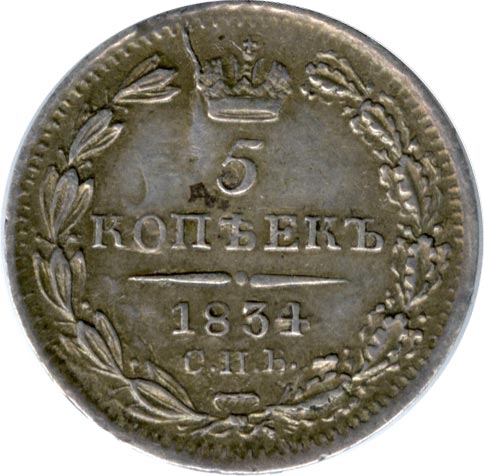 Лицевая сторона — новый гербовый орел с поднятыми крыльями, оборотная —обозначение номинала (5 копеекъ), окруженное венком из лавровой и дубовой ветвей и дата. Проба — 868, нормативный вес — 1,04 грамма.