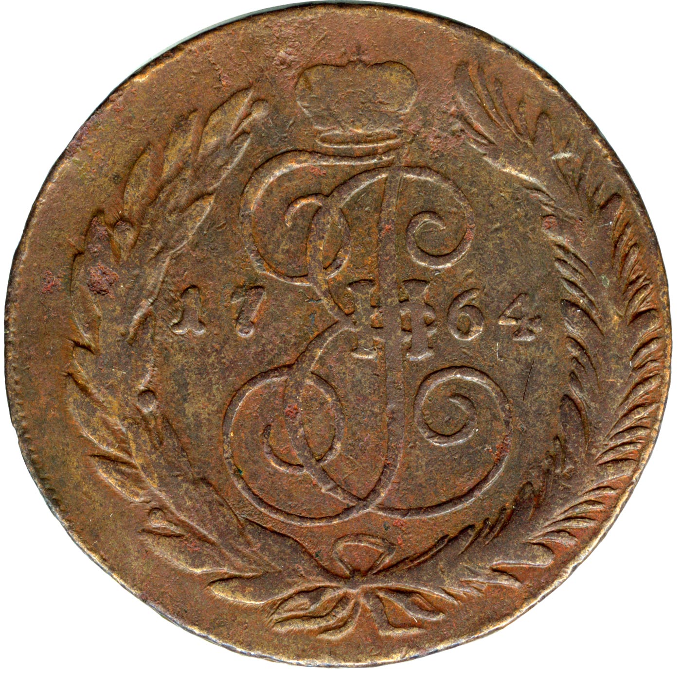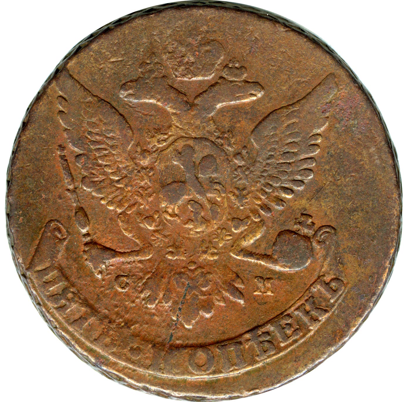 Лицевая сторона — двуглавый орел (выделяют 17 типов орла) и обозначение номинала (пять копеекъ), оборотная — вензель Екатерины II и дата. Нормативный вес — 51,19 грамма, гурт — сетка или шнур.
