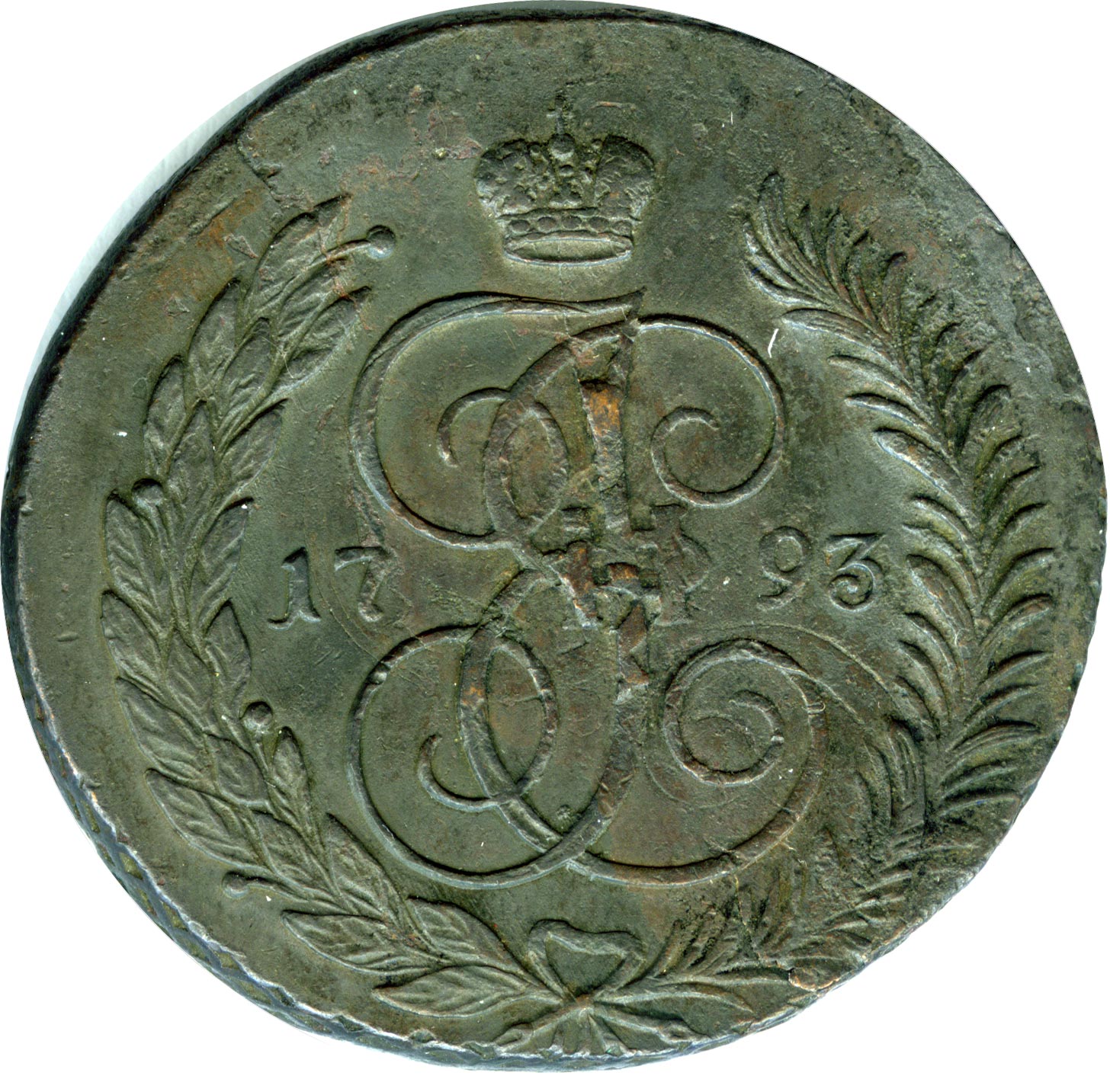 Лицевая сторона — двуглавый орел (выделяют 17 типов орла) и обозначение номинала (пять копеекъ), оборотная — вензель Екатерины II и дата. Нормативный вес — 51,19 грамма, гурт — сетка или шнур.