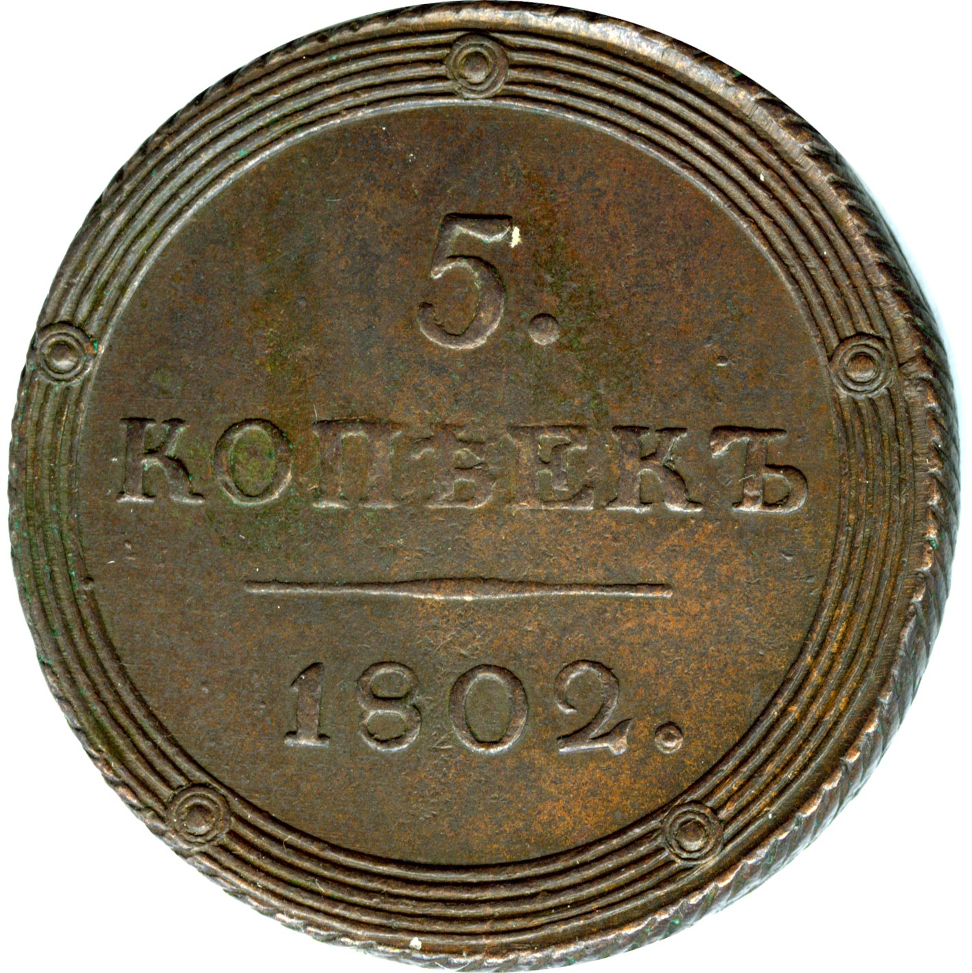 Выделка монет ведется только на Екатеринбургском (знак ЕМ)и Сузунском (знак КМ) дворах, причем в основном пятикопеечников. Номиналы от копейки и ниже выпускаются в очень незначительных количествах. Выделяют пять типов орла — три екатеринбургских и два сузунских; сузунские пятикопеечники 1802 года известны с зубчатым ободком вокруг линейных колец на обеих сторонах и без него, по встречаемости они примерно одинаковы.