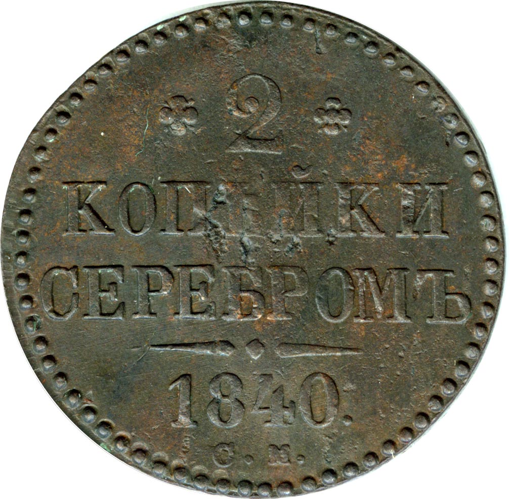 На новых монетах равенство серебряному курсу указано прямо в номинале: «2 КОПЕЙКИ СЕРЕБРОМ». Указ об их выпуске следует 6 сентября 1840 года («О новой медной монете на серебро 16-рублевого в пуде достоинства»). Массовая чеканка началось за год до этого на Екатеринбургском (знак ЕМ) и Сузунском (знак СМ) дворах. В качестве временной меры в 1840-1843 годах к ним подключается Ижорский завод (знак СПМ). С 1844 года после «значительного скопления медной монеты в народном обращении» в Екатеринбурге производство прекращается, а в Сузуне сокращается. Варшавский двор (знак MW), получив разрешение на выпуск общегосударственной монеты, успел отчеканить ее лишь в небольшом количестве в 1848 году.