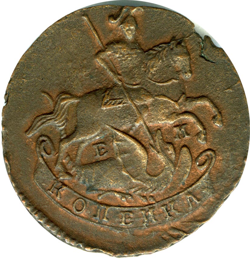 Лицевая сторона — Георгий Победоносец и обозначение номинала (копейка) в картуше, оборотная — вензель Екатерины II и дата. Нормативный вес — 10,24 грамма, гурт — сетка, или узор, или шнур.