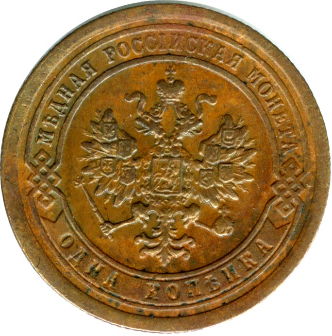 Лицевая сторона — двуглавый орел, надпись МЕДНАЯ РОССIЙСКАЯ МОНЕТА и обозначение номинала (одна копейка); оборотная — обозначение номинала (1 копейка) в бусовом ободке и дата. Нормативный вес — 3,28 грамма, гурт рубчатый.