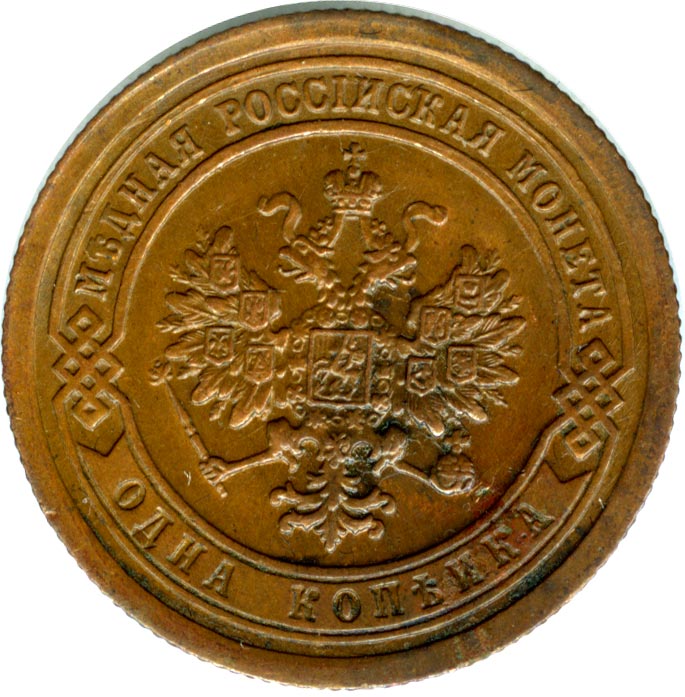 Лицевая сторона — двуглавый орел, надпись МЕДНАЯ РОССIЙСКАЯ МОНЕТА и обозначение номинала (одна копейка); оборотная — обозначение номинала (1 копейка) в бусовом ободке и дата. Нормативный вес — 3,28 грамма, гурт рубчатый.