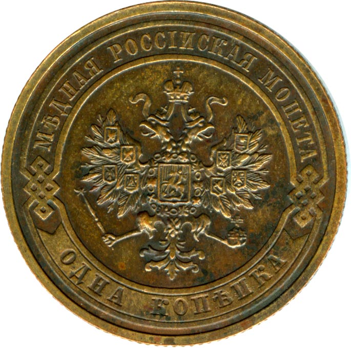 Лицевая сторона — двуглавый орел, надпись МЕДНАЯ РОССIЙСКАЯ МОНЕТА и обозначение номинала (одна копейка); оборотная — обозначение номинала (1 копейка) в бусовом ободке и дата. Нормативный вес — 3,28 грамма, гурт рубчатый.
