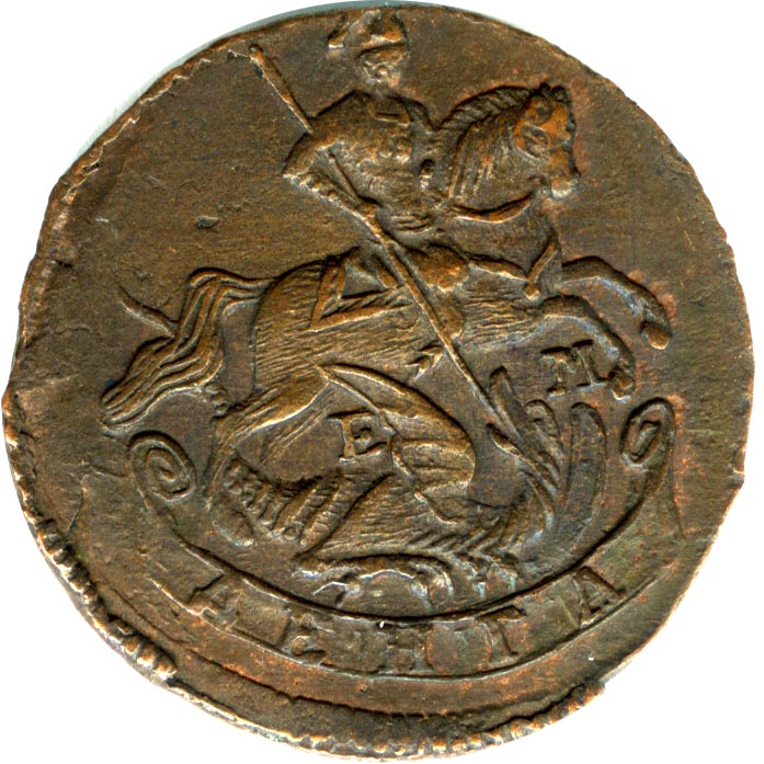 Лицевая сторона — Георгий Победоносец и обозначение номинала (денга) в картуше, оборотная — вензель Екатерины II и дата. Нормативный вес — 5,12 грамма, гурт рубчатый или шнур.
