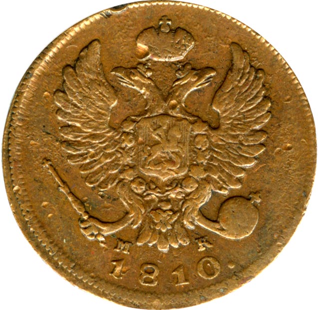Манифестом от 29 августа 1810 года для медных монет всех номиналов стопа увеличивается в полтора раза и становится 24 рубля из пуда. В следующие два десятилетия по этой норме чеканятся только двухкопеечники, копейки и деньги, призванные ликвидировать нехватку разменной монеты. В оформлении монет вместо кольцевых ободков на оборотной стороне размещается венок из лавровой и дубовой ветвей, как на серебряной монете.