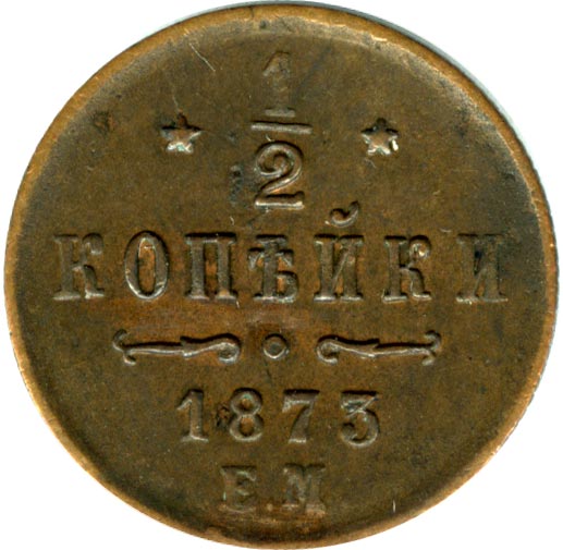 Лицевая сторона — вензель Александра II в венке из лавровой и дубовой ветвей; оборотная — обозначение номинала (1/2 копейки) и дата. Нормативный вес — 1,64 грамма, гурт рубчатый.