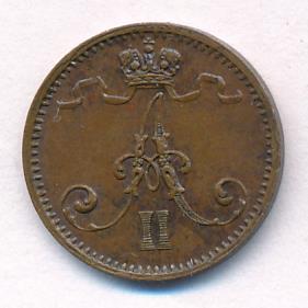 Лицевая сторона — вензель Александра II, оборотная — номинал (1 PENNIA) и дата. Нормативный вес — 1,28 грамма, гурт гладкий.