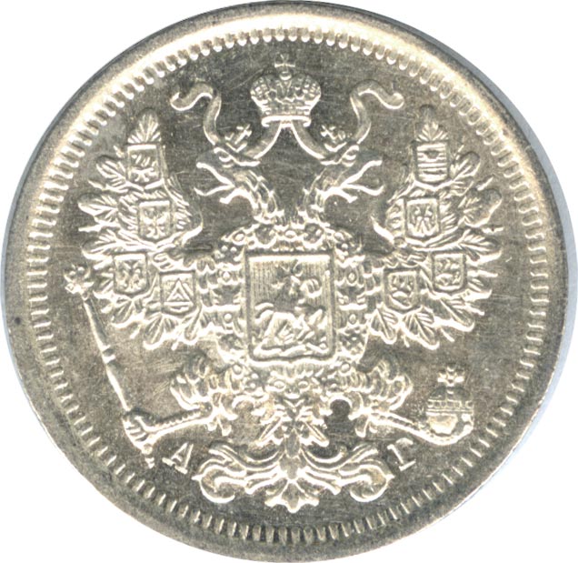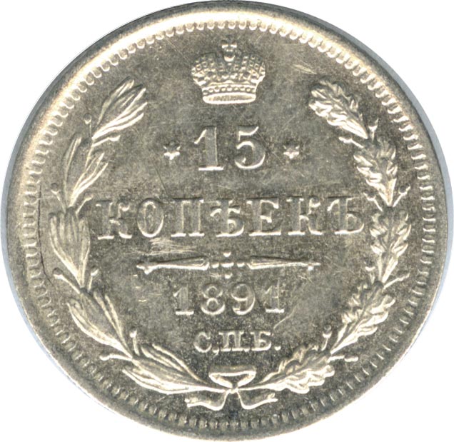Лицевая сторона — гербовый орел, оборотная —обозначение номинала (15 копеекъ), окруженное венком из лавровой и дубовой ветвей и дата.
